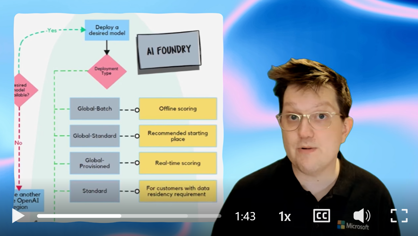 Above illustrates the process of provisioning Azure OpenAI, we start by using the Azure Portal. First, navigate to the Azure AI Foundry where you can select the appropriate model for your needs, such as GPT-4, GPT-4o, etc. Before users can consume the model, they need to select the model and create a deployment. There are several types of deployments available: