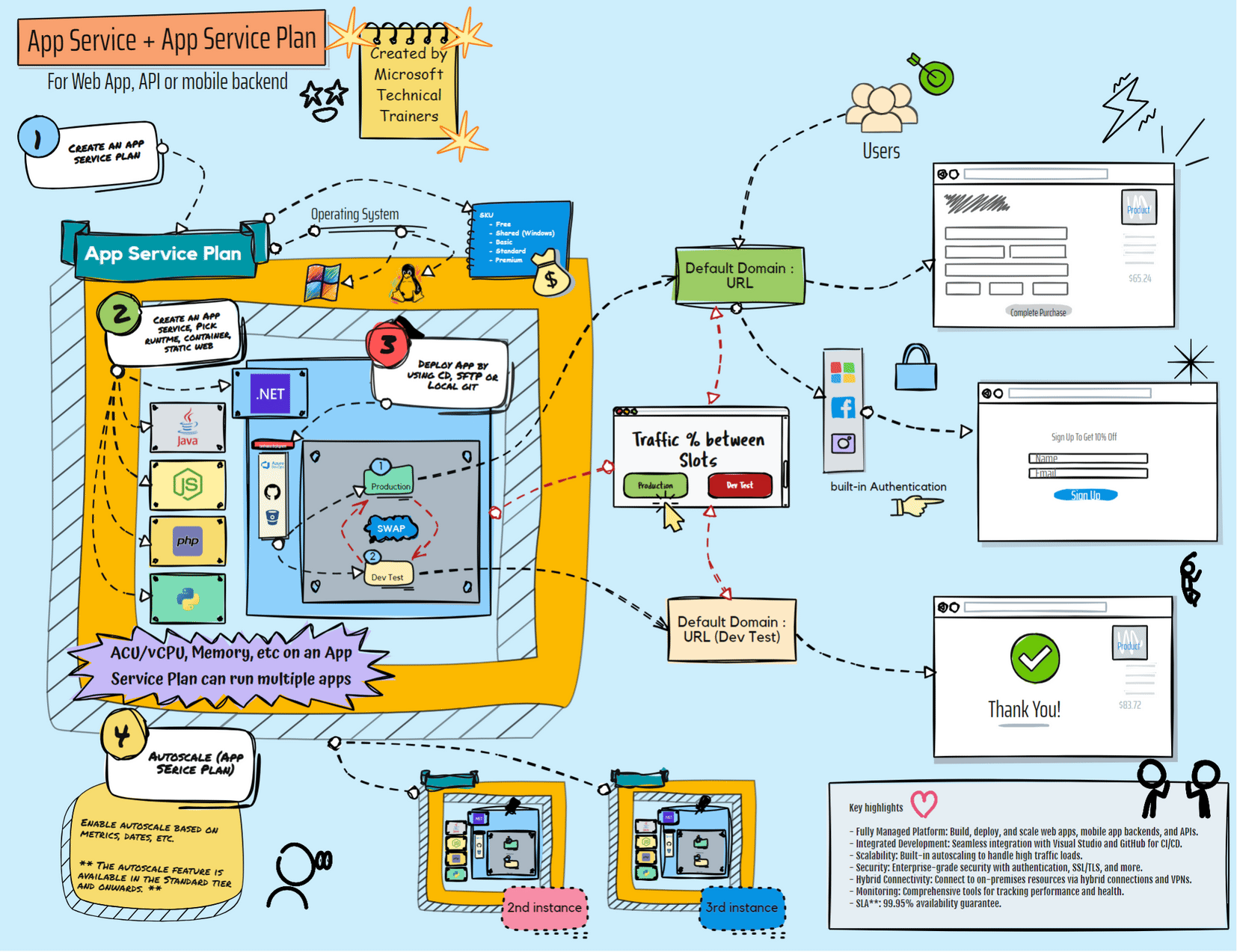 Above illustrates the process of using Azure App Service. We start by provisioning the App Service and App Service Plan. Here's a step-by-step breakdown: