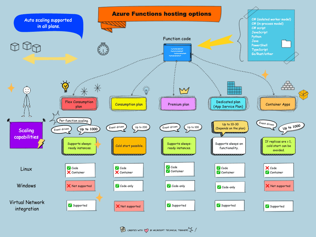 ⚡ Azure Functions is a serverless computing service that enables you to run event-driven code without managing infrastructure. It offers various hosting plans, each designed for different workloads. All plans support auto-scaling, but they differ in scaling limits, pricing💰, and features🛠️.